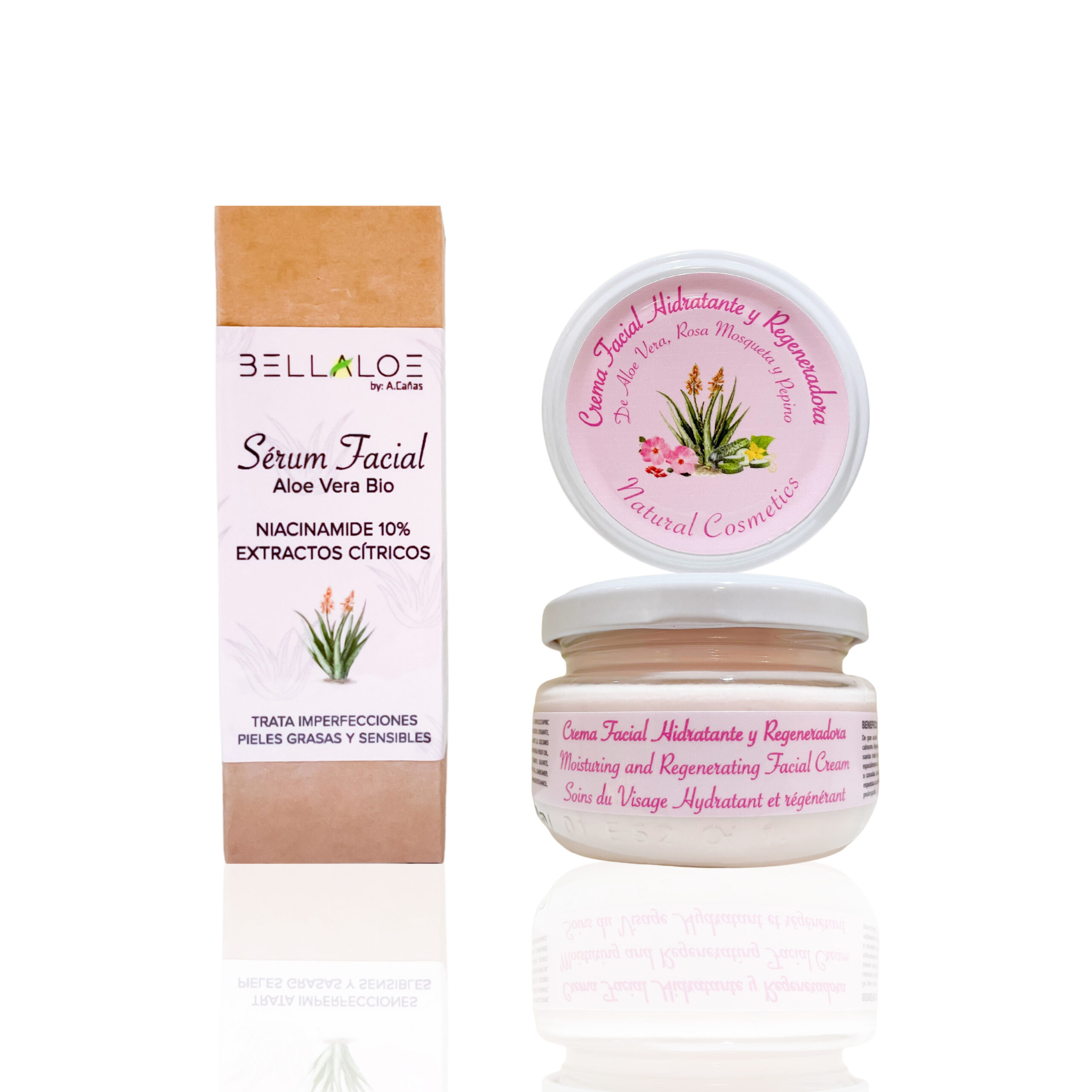 Con el Pack Pink de Bellaloe, formado por nuestro exclusivo sérum facial de jugo fresco de aloe vera ecológico, niacinamide y extractos cítricos, y el tratamiento facial hidratante y regenerante; elaborado con nuestro aloe vera ecológico, aceite de rosa mosqueta y extracto de pepino, para una hidro-regeneración intensiva, gracias a las funcionalidades de sus principios activos que regulan el PH, la producción de sebo, el acné, las manchas, etc.